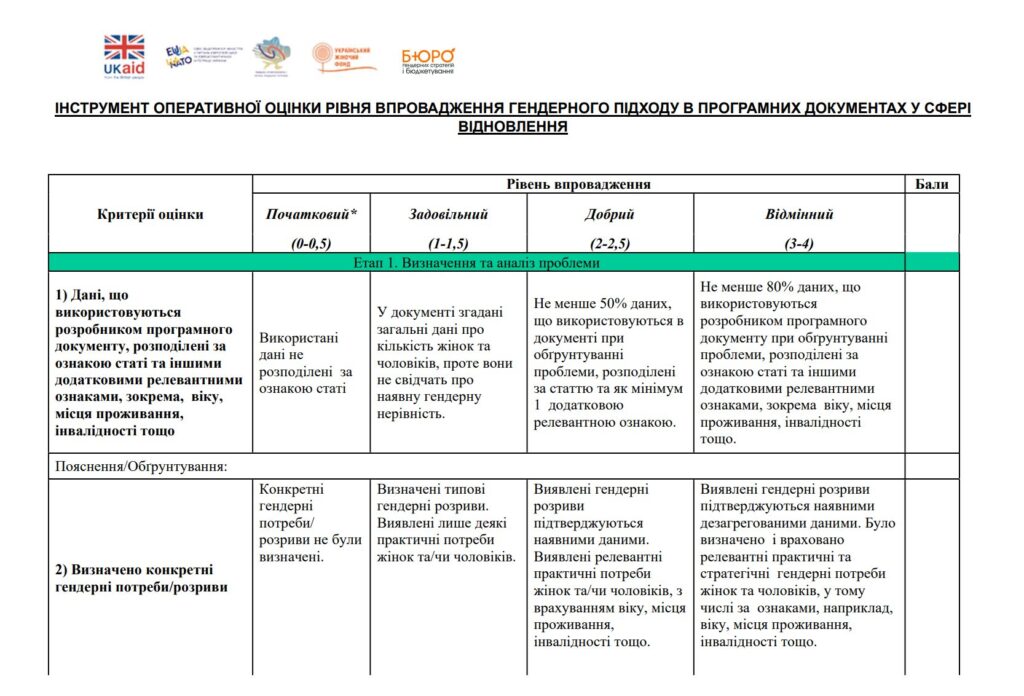 Інструмент оперативної оцінки рівня впровадження гендерного підходу в програмних документах у сфері відновлення розроблений експертками Аналітичного центру ГО “Бюро гендерних стратегій та бюджетування”, враховуючи чинні українські НПА у сфері розробки програмних документів та гендерної рівності на основі “Інструменту визначення рівня впровадження гендерного підходу в публічних політиках” (за результатами вивчення досвіду Centrul Parteneriat pentru Dezvoltare, Republica Moldova).